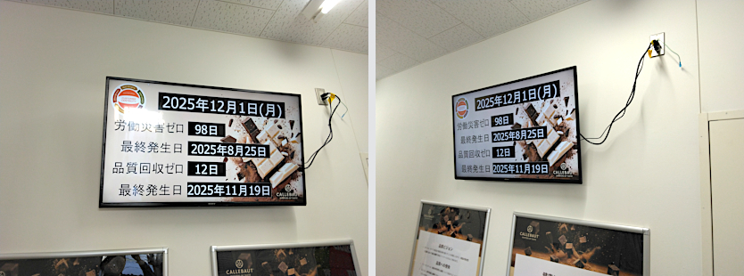 労働災害ゼロと品質回収ゼロの連続日数記録を表示するデジタルサイネージを工場入口に設置することにより、社員の安全や品質に対する意識が向上しました。