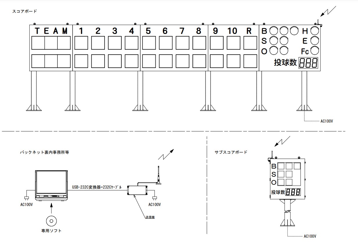 TEAM名:16×16ドット500mm角LED(1文字)/3色(赤・緑・黄) 得点:16×16ドット500mm角LED(1文字)/1色(黄) BSOHEFc:約300φLED球/各色 投球数:7セグメントH360mmLED/1色(橙) |