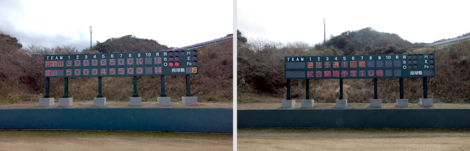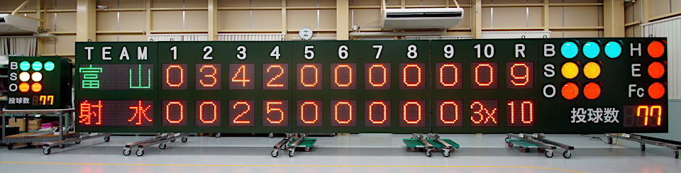 野球の試合運営に不可欠なチーム名、得点、BSO(ボール・ストライク・アウト)などの表示に加え、試合前のメッセージ表示も可能な多機能LEDスコアボードとして導入頂きました。