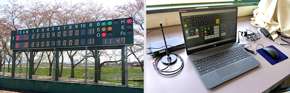 野球場にてチーム名、各回得点、合計得点、BSO、および時計を表示させたいとのことで導入頂きました。