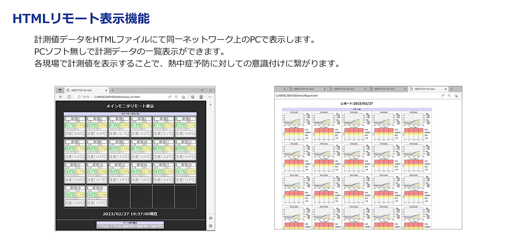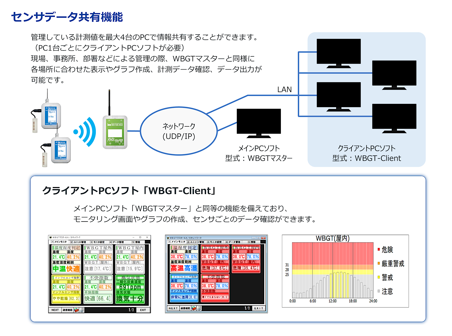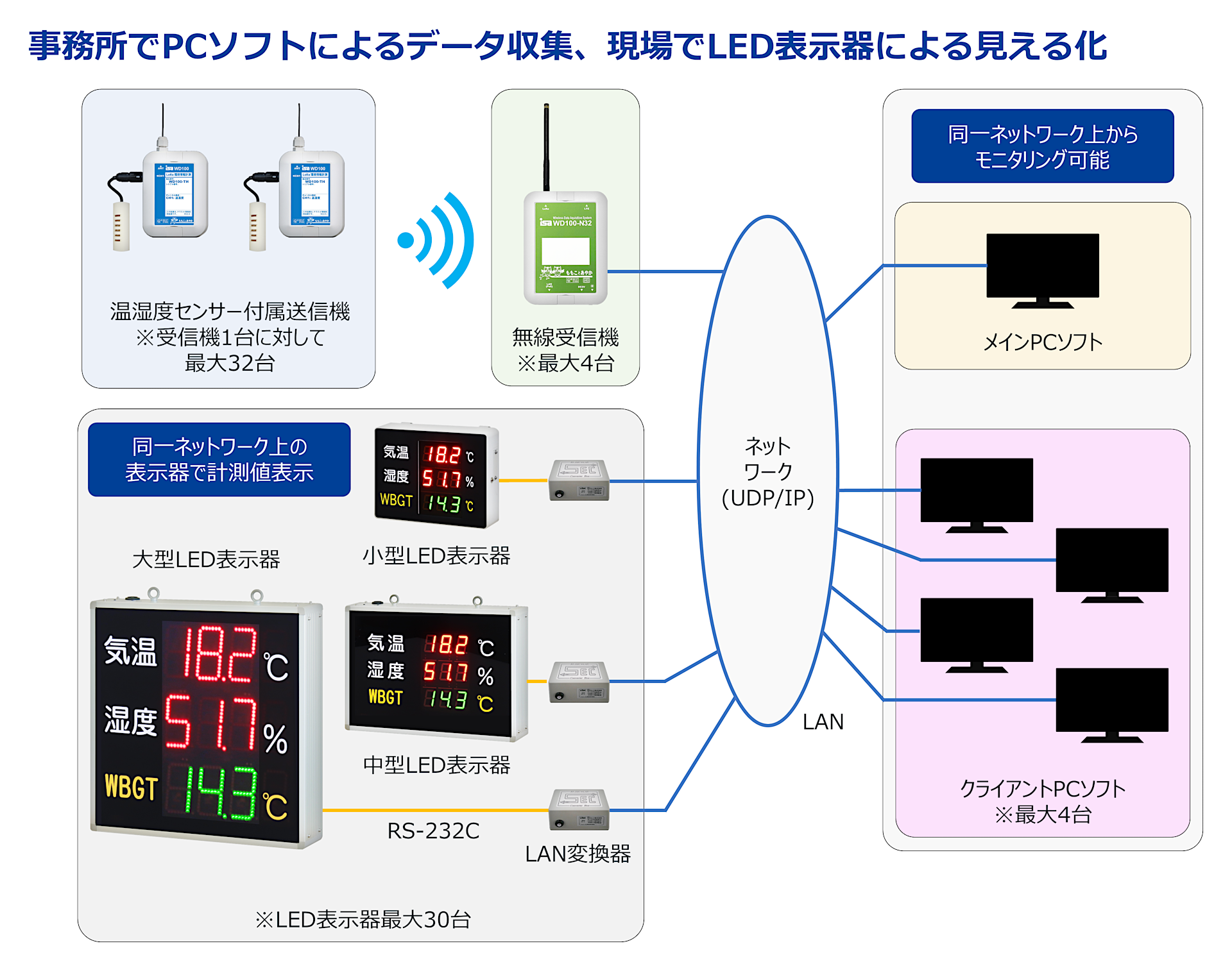 PCソフトにより温湿度データから熱中症指数、不快指数、インフルエンザ指数を算出し、液晶モニタやLED表示器で表示することで見える化を実現します。